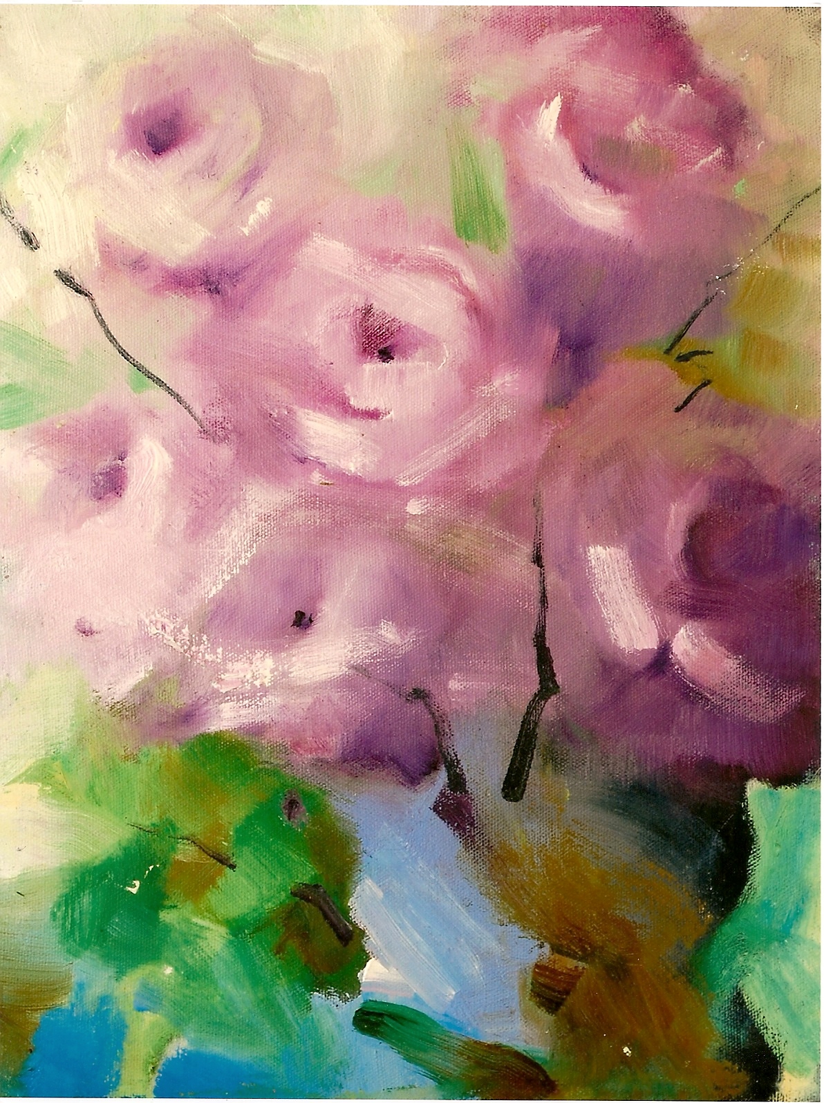 A pintura evoca serenidade e introspecção, capturando a essência das rosas em um momento de quietude e beleza. A harmonia cromática entre os tons de rosa, lilás e verde remete à natureza em sua forma mais tranquila, convidando o espectador a uma pausa contemplativa.